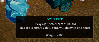 ¶ Part 3 - Deliver the Azureite Flame and three Azureite Ore to Marv the Miner in the town of Minoc (You must place the three Azureite Ores on the ground simultaneously near Marv the Miner and select them one at a time when prompted). You will be given a Golden Pickaxe.
